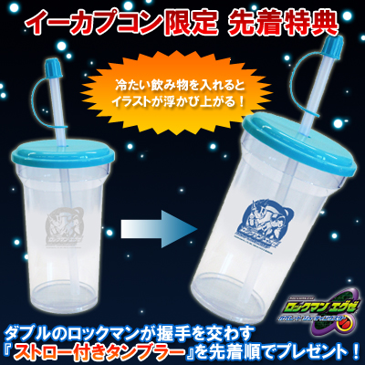I’ve ordered Rockman EXE Operate Shooting Star already. I’ll get it and probably enjoy it. But I did not order it through e-Capcom, so I will not be getting this special edition drinking cup which they are giving to people who preorder through e-Capcom. Sadness. The cup is equipped with a straw that can be capped. But what’s even “cooler” is the double Rockman image on the cup that turns blue when cold contents are poured in. Definitely what you’d want to be drinking out of while busting some viruses in OSS. I, instead, will be drinking out of my Harkens Theatres 2009 value cup. Sadness.