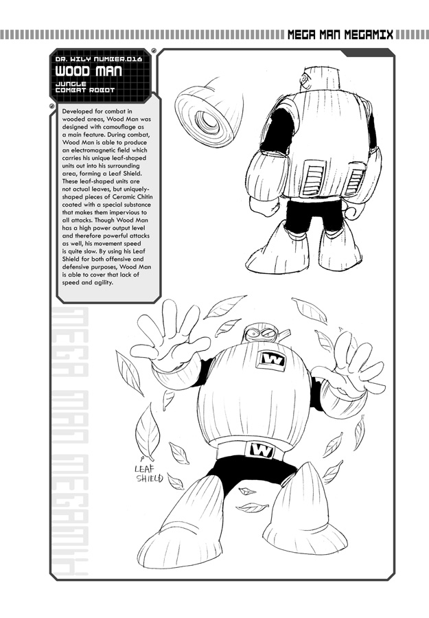 In the meantime, so as to avoid a robot revolution of their own, they are offering some preview pages from the profile section of the book. Last week, we got to learn why Quick Man is so darn quick. This week, we discover how it seems a handful of leaves can survive attacks that would leave most cities reduced to rubble: