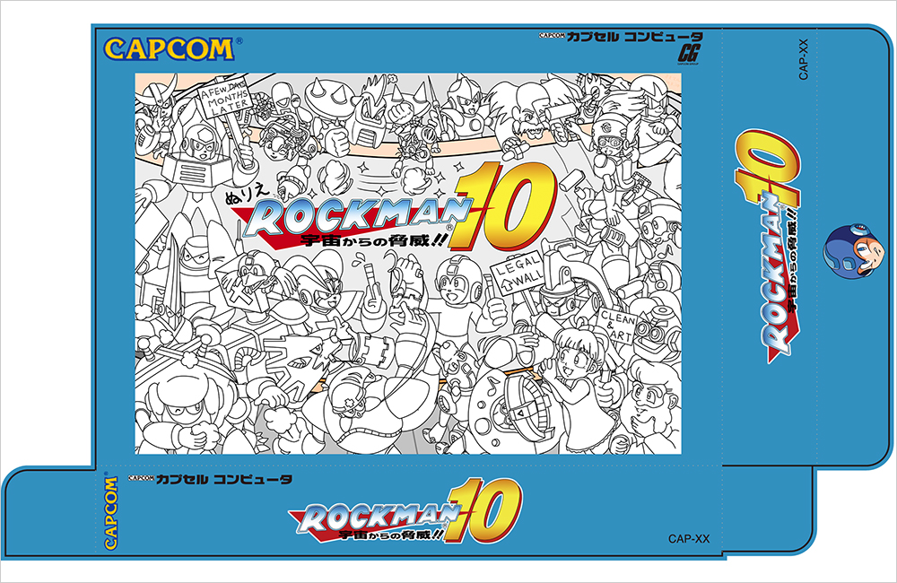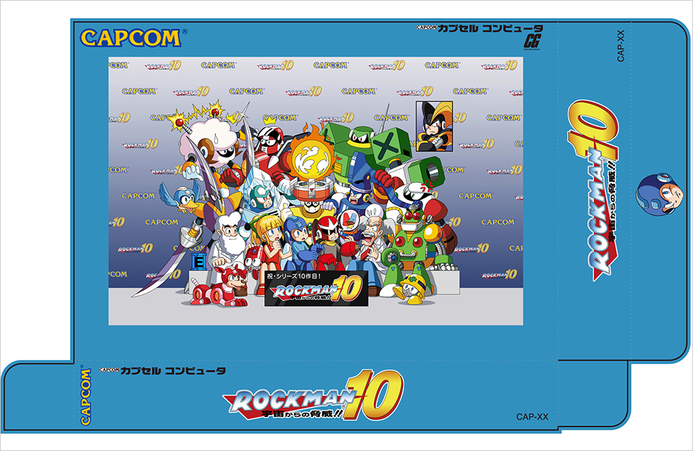 Comment from MM10 producer Takeshita: This picture overflows with the happiness of children pleading when lining up in a toy shop. The production of the brightly shining effect behind Rockman and co. is also very deep. The package designs for 3 and 4, and 9 too, now that I think of it, have this direction. And being full of the boss characters’ faces drawn in, it’s wonderful.