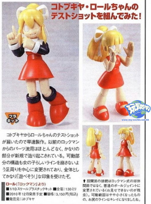 Kotobukiya’s Roll figure kit should be released in a matter of weeks if not days. As a sign of its impending production, a hobby magazine has released some shots of the figure crafted with a test run of the mass production parts. This should give you an idea of what to expect when you make the figure yourself. While painting is certainly not required, it is needed to make the figure look as good as the promotional prototype.