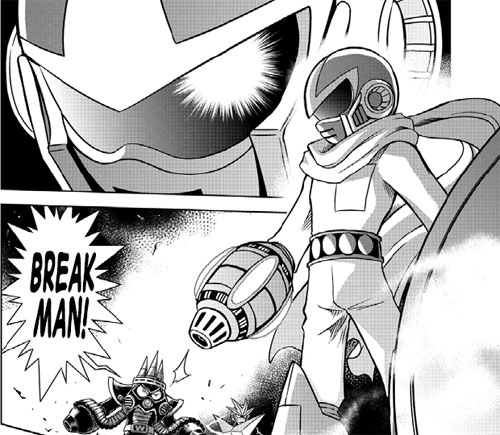 I especially like how Ariga handles Dr. Wily in his series, he seems so maniacal, but believable. He’s obviously a genius; he’s just a maddened genius. He’s arrogant and snobbish, giving him more of that edge as a developed character, much more than “take over the world” sort of mentality. Not to mention his ability to constantly boast when needed.In the Battle & Chase chapter, he takes a bit of a crazy and reckless turn, which is perfect for the mood given. Oh yes, let’s not forget the Doc Robots, who are incredibly menacing even in their own brief appearances.