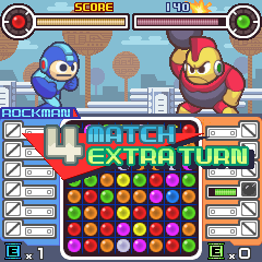 The rules are pretty basic. You swap blocks next to each other and try to line up three or more of the same color horizontally or vertically. This makes Rockman attack his opponent, and you beat the opponent when their life gauge reaches zero. As an added feature, although it’s not explained in great detail, Rockman can gain special weapons from his defeated opponents and use them to cause various effects in puzzles.