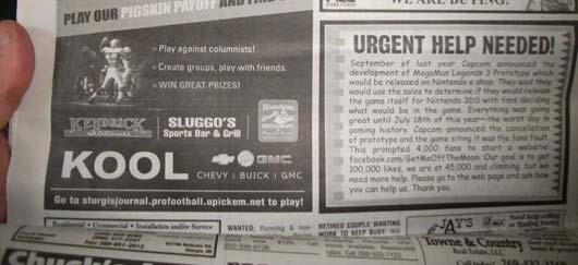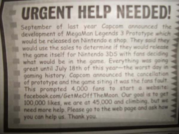 Perhaps one of the most interesting comes to us from our friends at Joystiq, by way of MMN reader Vas. Paul Barrett (whose surname we are unsure if he adopted, or was just a really interesting coincidence) of the 100,000 Strong for Bringing Back Mega Man Legends 3 Facebook group recently took out an ad in his local paper, The Gateway Shopper, which apparently has a circulation of around 9,838.