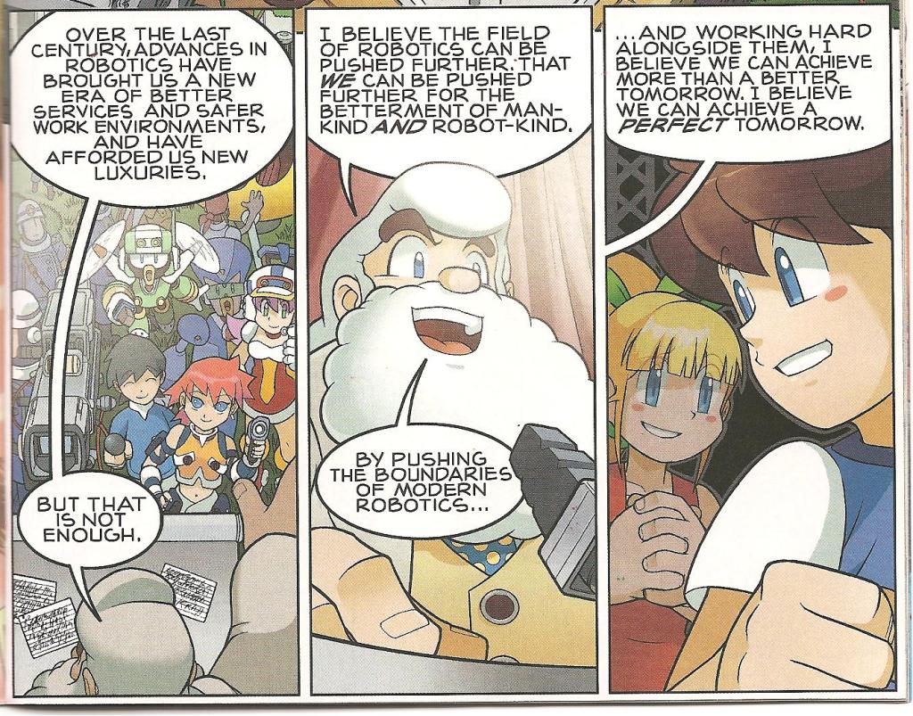 And this is where the comic shines: Though at the forefront of it is the fight between Mega Man and the machinations of Dr. Wily, the subtext at play is the world as it was, and how Light’s desire to change it to his more utopian view of the future guides a great deal of not only his actions, but that of Mega Man as well. Children learn from their parents, after all. I would bet that there will be more of this hidden, or not so hidden debate as the story progresses.