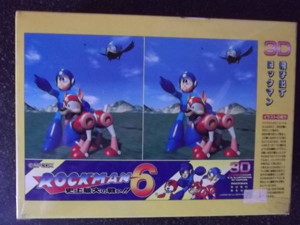 Well, not necessarily as far as games go, but here’s a neat piece of merchandise I’ve not come across before. This is a 300 piece 3D puzzle for the game Rockman 6, released back in 1993. By 3D, I mean both the featured artwork is 3D, and the puzzle itself creates a stereoscopic image. The box front seemingly shows both frames used to create the 3D effect. Pretty cool, though I wish they could’ve made a more exciting scene…