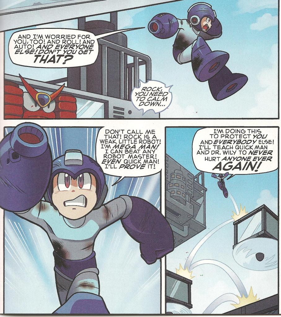 For Mega Man, there are two battles raging in his subconscious: Doing just enough damage to stop Robot Masters without destroying them, and figuring out which personality is dominant; Rock or his fighting alter-ego, Mega Man. The second, psychological battle, is one that is commonly pursued in the fandom. It’s also been previously used in the first story arc of this comic. The battle between Rock and Mega Man is starting to play itself out, and Mega Man is winning. Why doesn’t he stop and go home for repairs and upgrades like Light wanted him to? Why is he so obsessed with taking out all eight Robot Masters in a single life with no recharges between? Not saying it can’t be done, but it’s not the safe play. And Mega Man’s not supposed to be the fella who ignores the safe play; that’s Proto Man’s territory, and the next century after, Zero’s.