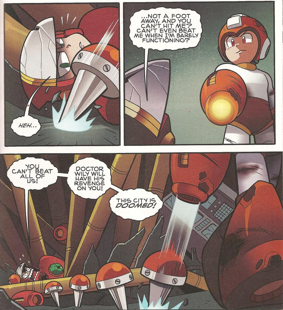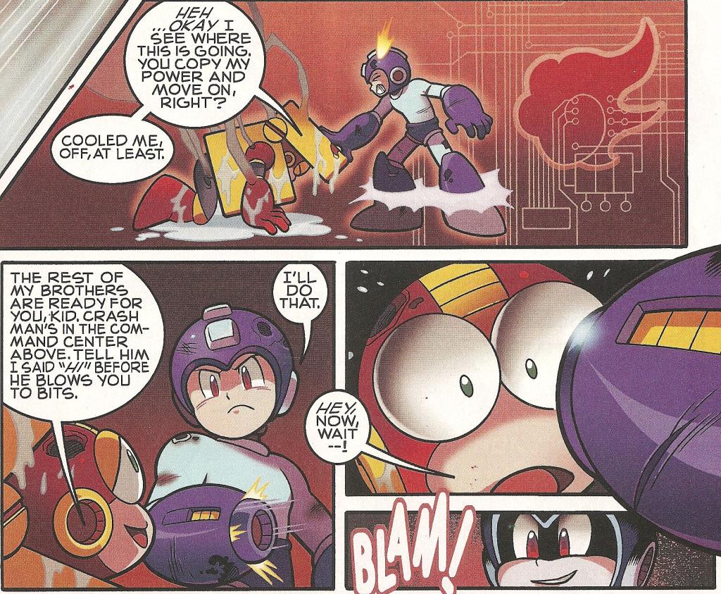 Back in the action, Mega Man climbs out of Heat Man’s domain up into the “Command Center” and has his face to face to with Crash Man. The cover lies slightly; their fight is a marvelously explosive one, but Mega Man doesn’t get into fisticuffs with the guy. Instead, we learn that Crash Man has two settings: Joshing around and BUUURN! BURN IT TO THE GROUND! I know we all like to pretend Mega Man X7 didn’t happen, but you have to give it up to Flame Hyenard’s VA for constantly screaming that all the time.