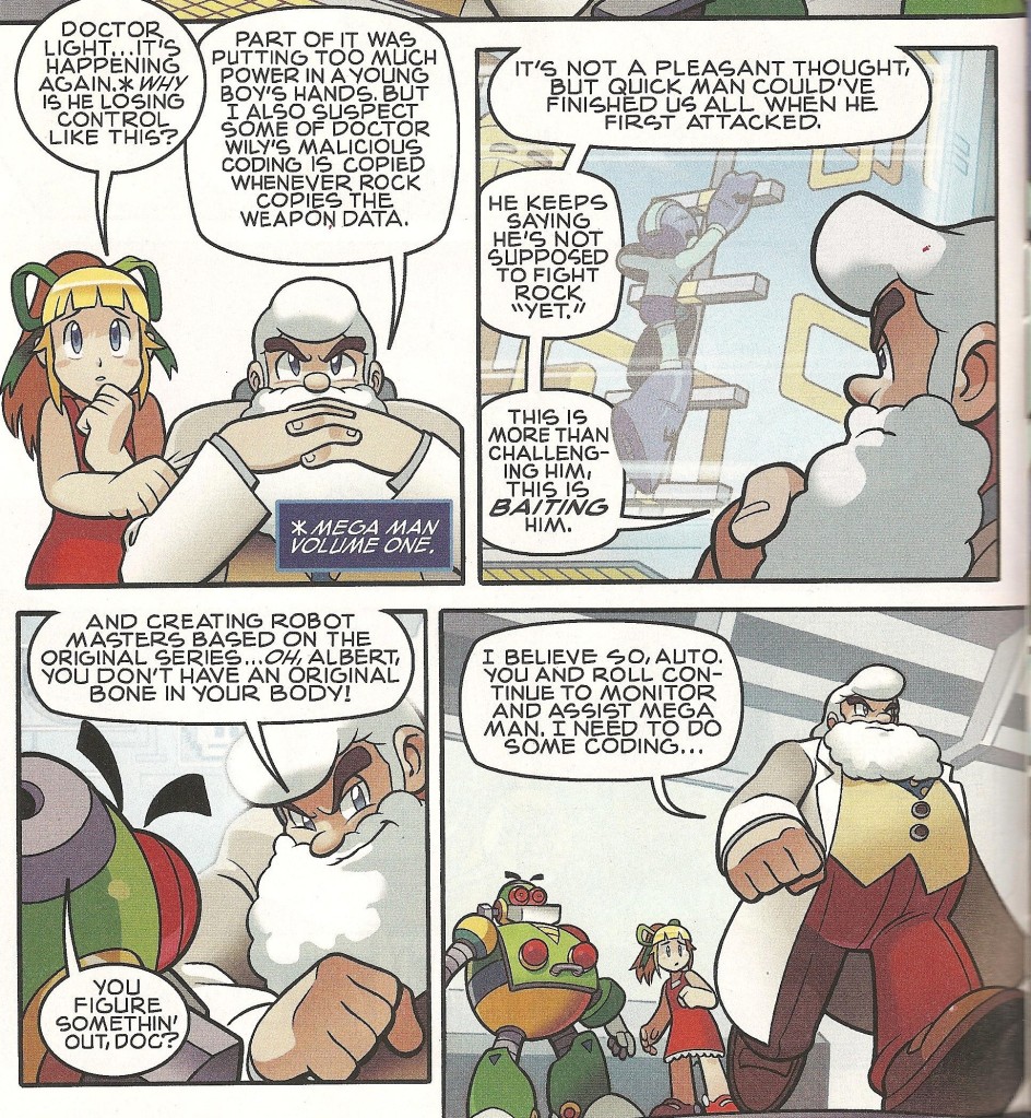 The comic’s writers are dialed in to the idea that “Mega Man”, Rock’s super-fighting robot persona, is a side personality he’s developed to insulate himself from the psychological trauma that combat does to him. We can safely assume that Wily is aware of it; he kept tabs on the six originals during his first bid for world domination, after all. He would have undoubtedly left some cameras around to record Rock’s fall from grace. Now, he’s accounted for it.