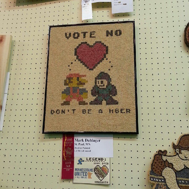 Rock Miyabi dropped us a line about the recent Minnesota State Fair, which had a contest for crop/seed art and a special division for political stands against a proposed state marriage amendment. The artist, Mark Dahlager, took second place in the “30% Dyed or Painted, Advanced Category.”
