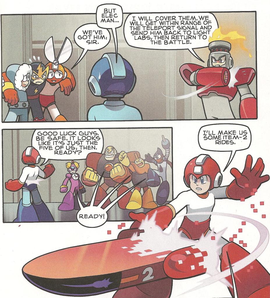 The team, meanwhile, has a new problem: What to do with Elec Man, who’s close to hitting auto-shutdown? Ice Man and Cut Man volunteer to pack him out, with Fire Man acting as their support. Everyone else goes with Rock, because there’s still a madman on the loose.