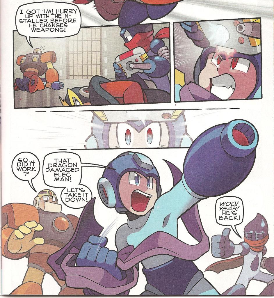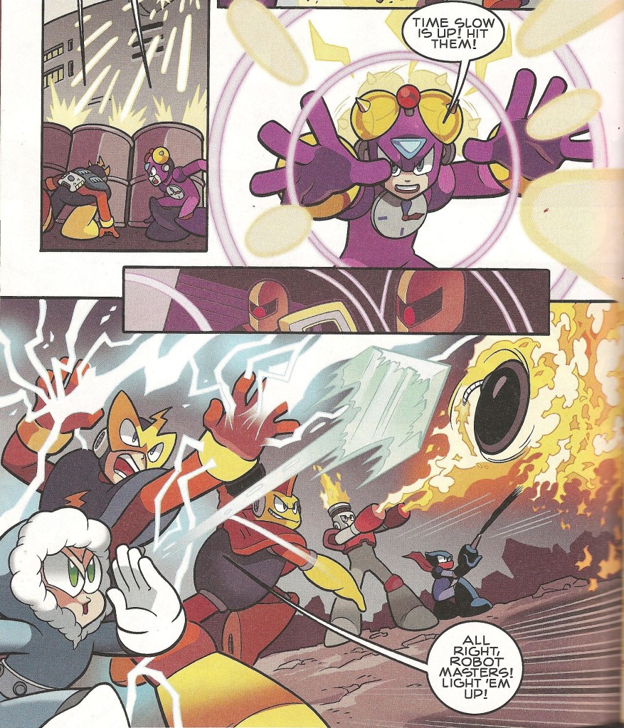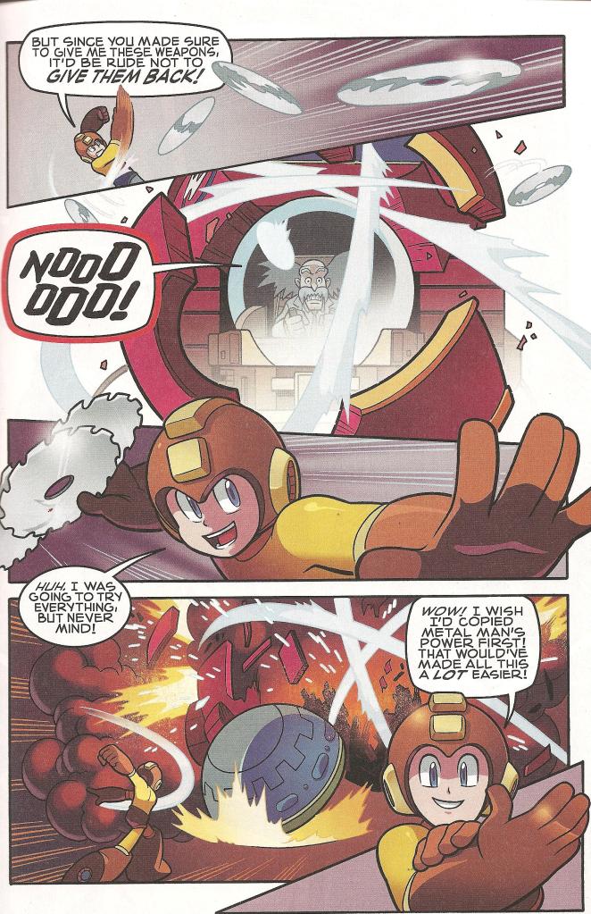 This issue was plenty crowded; you had to save Rock, handle three Fortress Guardians, and deal with Wily in the span of its pages, and they pulled it off. Though they went to some average sized-panels from time to time (this comic loves to oversize its panels through most issues), they never felt cluttered, and that’s the important thing. I always understood exactly what was happening: No confusion in the images to mess me up.