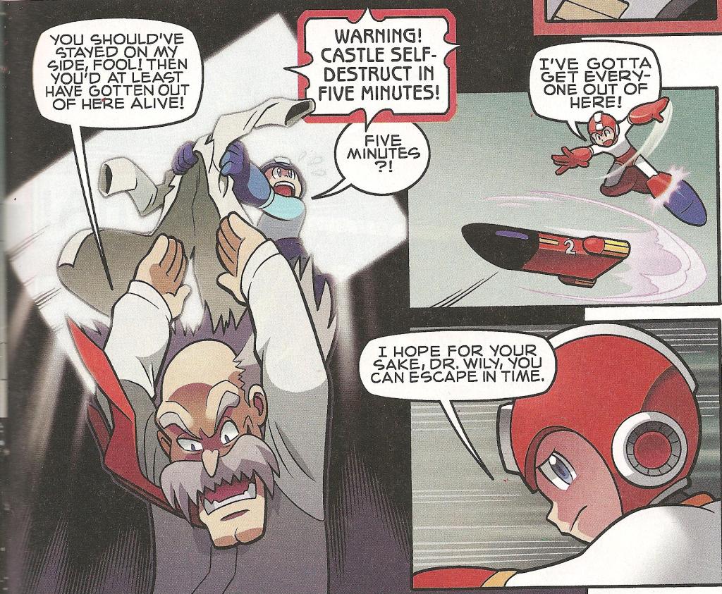 That’s right. What you must always keep in mind when capturing Wily is this: Watch out for trap doors, rotating walls, collapsing ceilings, and robotic fakes whose heads pop off Rock’em-Sock’em style. Also remember that as soon as he gets away from you, because he always will, the base will begin to self-destruct. It will always self-destruct. And you’ll always make it out in time, because the game takes over for you. It isn’t like other games, which put you on the clock and force you to make your own escape out of the depths before the entire thing blows up all around you, perhaps even taking the whole dang planet. The comic has a nice little escape sequence for Rock, where he flies out of dodge and grabs every Robot Master he can. It’d be a bad thing to lose the team now.