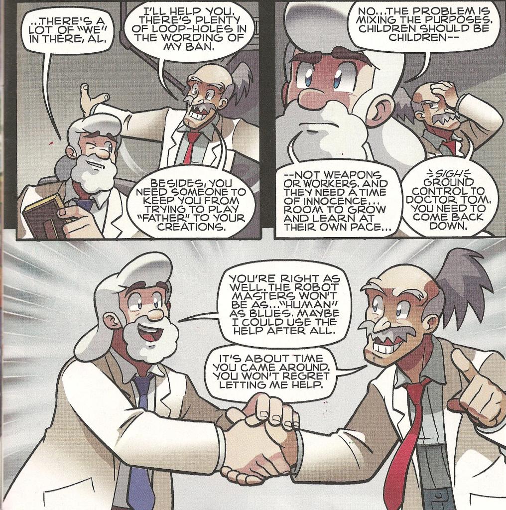 Light finally comes to terms with the lessons of Blues: Children should be allowed to be children. Weapons of war and robotic “life” need to be kept separate. The future Robot Masters that they will build will be less human, not more. That way, the pain of loss will be decreased. Wily is pleased, and why shouldn’t he be? Finally, Light is seeing reason.