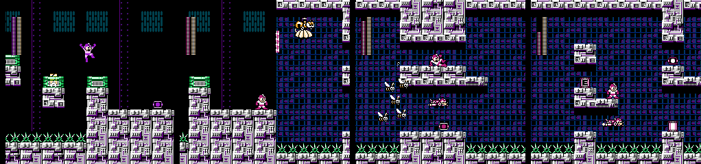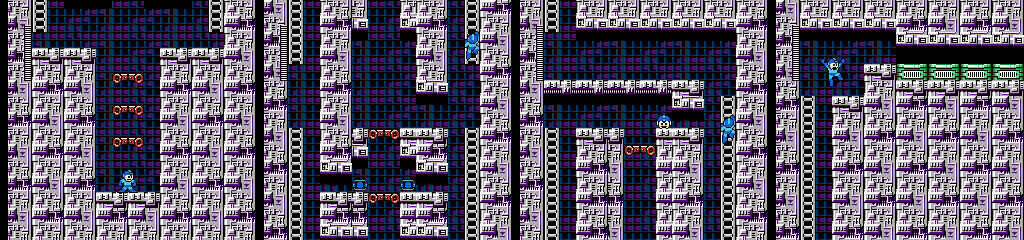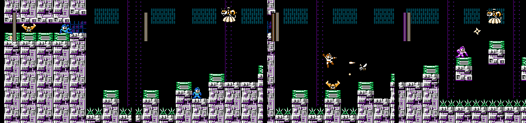 Here we see a return of the floating platforms from the second visit to Shadow Man’s stage, except this time they act only as a minor annoyance on the way to a few more items. There’s a split in the path with one way leading to an extra life, but unlike previous examples of this setup, there’s nothing dangerous on the way that might discourage a player form just grabbing everything. I do appreciate being able to slide over to the main path though.
