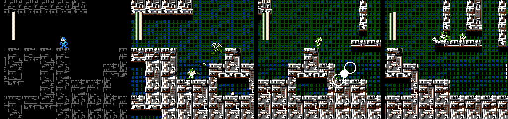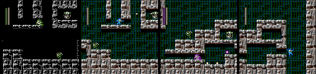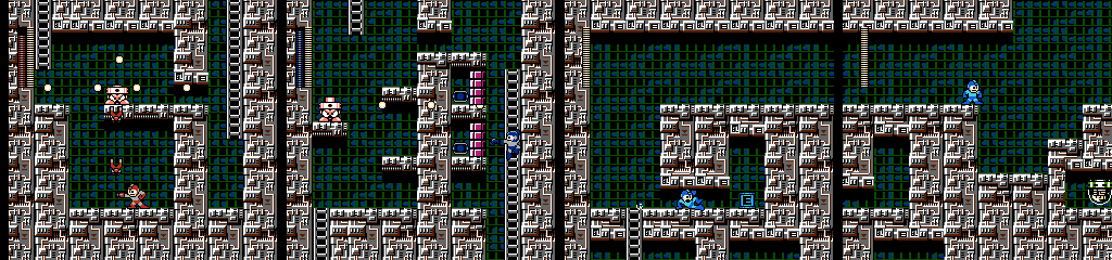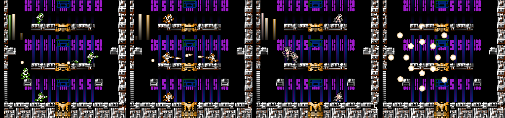 These are Holograph Mega Mans. They run in opposite directions while firing towards Mega Man’s position, and periodically warp out and back in. Only one can be damaged, and each warp changes which one that is. Though they change colors to reflect Mega Man’s chosen weapon, they’ll always fire the normal pellets.