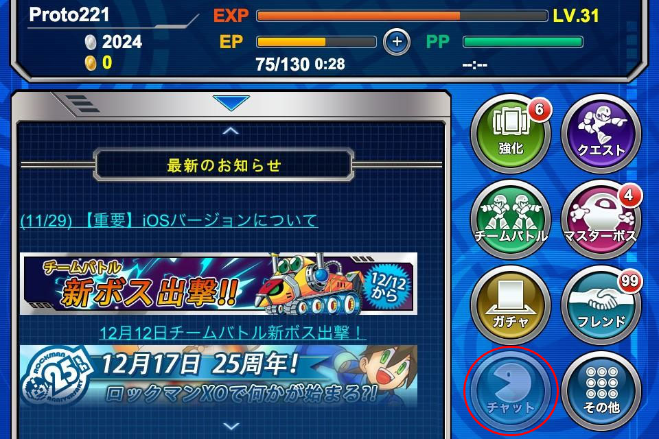 However, it appears Rockman Xover is getting equipped with a chat feature soon (if not already). The circled button on the bottom of the menu is a chat button, although it doesn’t seem to be available yet (I’m unable to play Xover myself at this time). With the ability to chat with friends, players may be able to develop more of a sense of purpose in the game aside from just constantly leveling up. But this remains to be seen with how the feature is implemented.