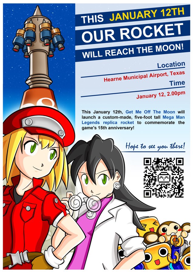 The event will be held at 2pm at the Hearne Municipal Airport in Hearne, Texas, and is a public event, “so anyone living in this area is free to drop by, meet the team, and watch our rocket take off!” For those curious, the rocket itself was constructed by a model rocketry professional of 18 years, and is designed to look like the one being constructed by Roll Caskett and Tron Bonne in the ill-fated Mega Man Legends 3: Prototype Version.