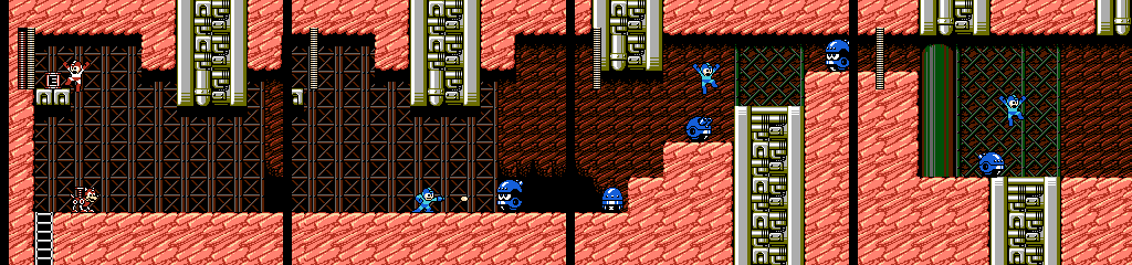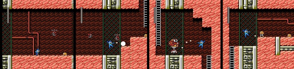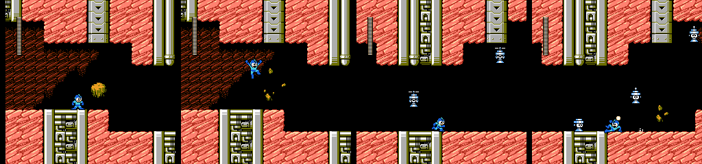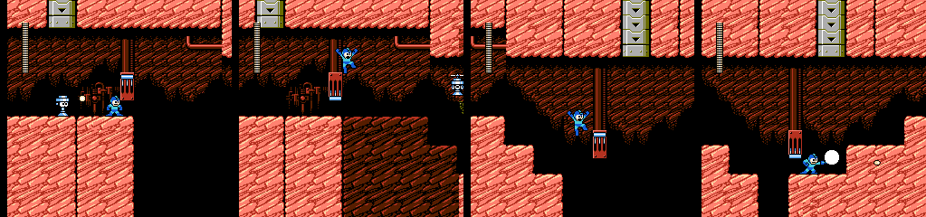 The two dangers in the final area are rocks that drop from the tubes above when we get close, and Helipon who flies around slowly for a while before dropping. He starts shooting after hitting the ground, but since he dies in one hit this shouldn’t happen often. However, he often appears out of our reach initially, which might give them a chance to shoot when an impatient player runs under one and then gets held up by the rocks.