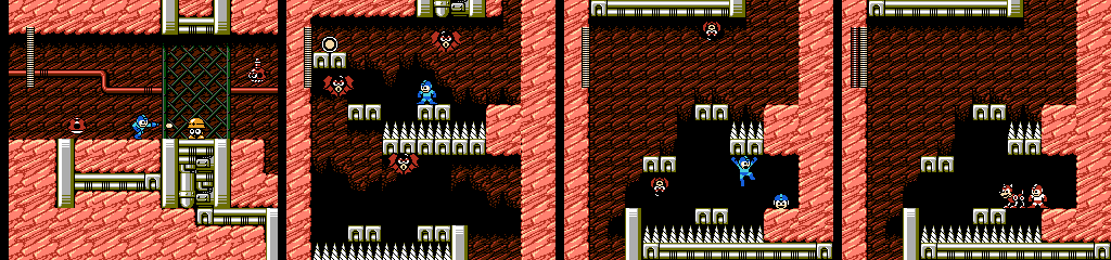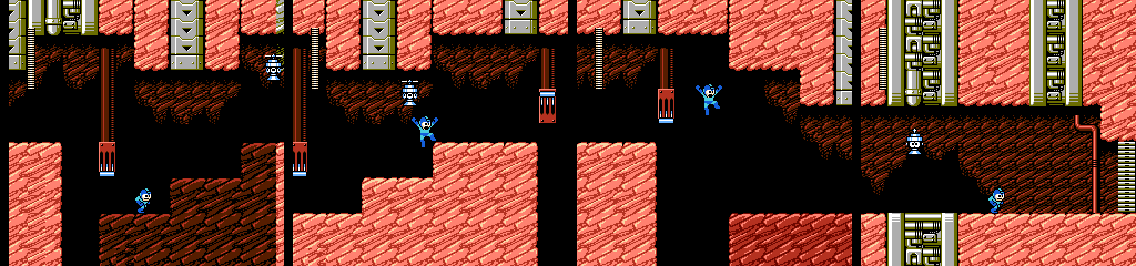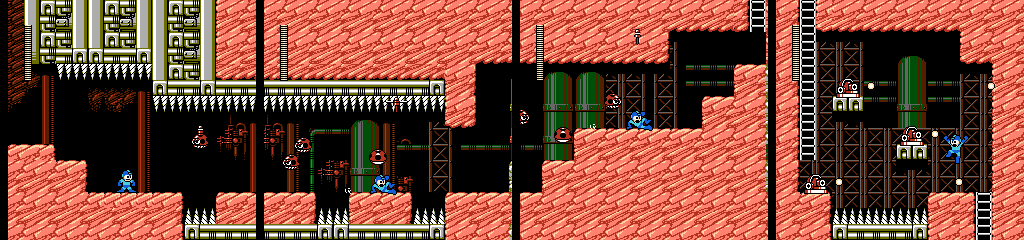 This area combines Taketento with more spiked gaps. The spikes on the ceiling are a nice touch, as Mega Man can only reach the first few but they might make the player wary of jumping too high, making the gaps harder for themselves. A couple Taketentos also appear at the perfect height for sliding under, since they move upward after losing the propeller. They can be shot easily enough, but it’s always good to have multiple options.