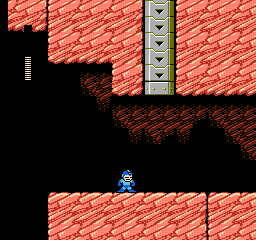 Battontons guard this short platforming section. We have a choice of fighting them first, or taking a short hop under the first and only destroying the second. This is also a good spot for a health refill, as it might be needed here, and it slows the player down for a moment in the corner of the screen, giving the bats more time to get in the way. The next screen does the same by putting one bat high enough to be out of the way, so a player might rush for the extra life only to be ambushed on the way back. The jump here is difficult, but Rush can be summoned on the other side of the gap, making it easy to bounce across.