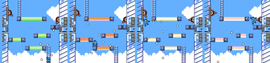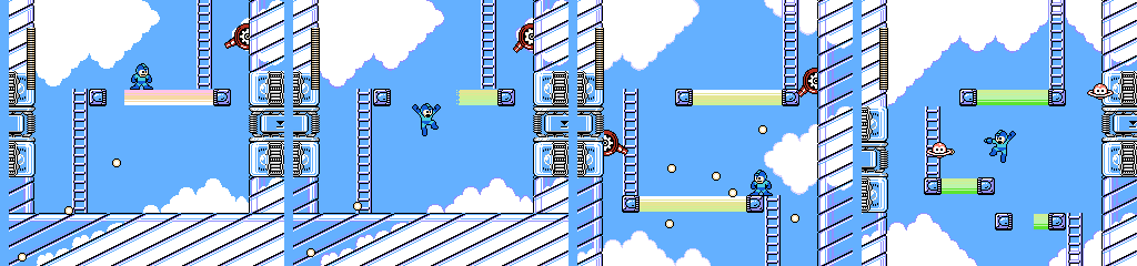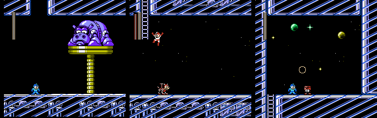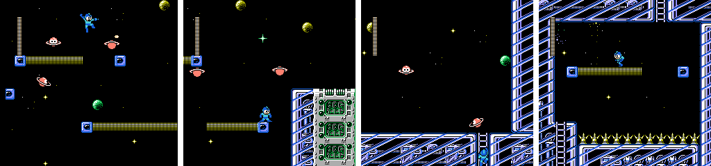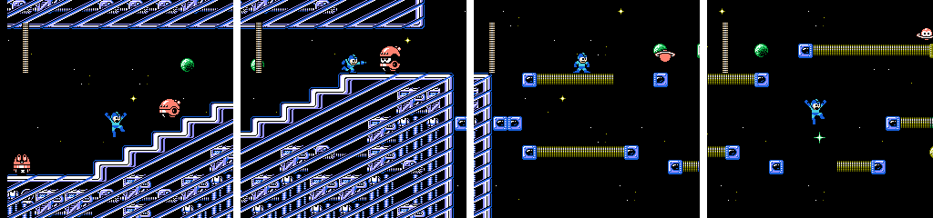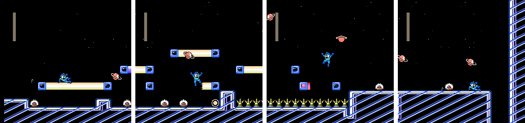 As we saw in Drill Man’s stage, stairs are a good environment for Mono Roader. This time we get more headroom at the cost of having more stairs and thus less stable footing. The brown platforms move in the opposite direction, and are much faster. Since we’re still moving to the right, this means we’ll have a gap in front of us if we try to run across. We can’t follow it as it refills either, though jumping on as it comes forward does give us more time. Dropping from the ladder leads to a nasty surprise, as we have to cross one last brown platform from right to left. Mega Man can make it across if we start moving as soon as we land, but waiting on the right for it to cycle won’t hurt.