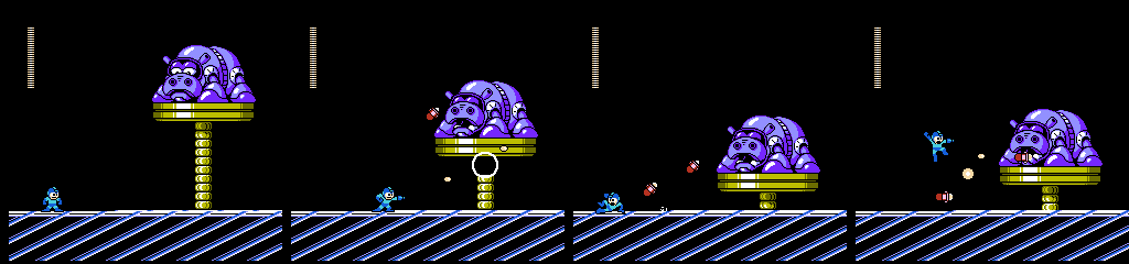 Our last obstacle is another Whopper. This one can hit Mega Man in the corner, so we’ll need to jump when he attacks. This makes the fight even worse, as now we’ll take damage if we time our jumps to the moment he opens, but if we wait for the ring to pass under us we won’t get a shot in unless he fires at maximum range. What used to be a boring timing game is now an even longer timing game or a gamble.