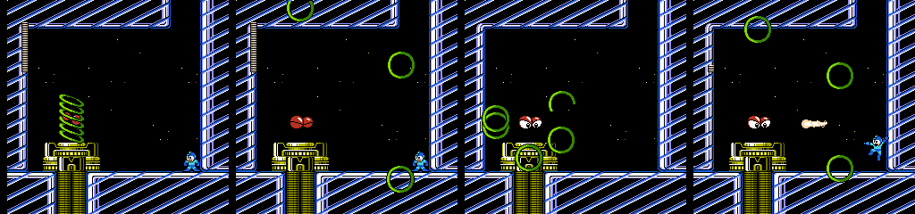 The easiest way across is to jump or slide (if it hasn’t been triggered, it won’t start moving until Mega Man stands up again), but we can also trigger it early and start running as it refills. On the next screen we have two Wall Blasters to deal with, but since they’re limited to certain angles, we can find a safe spot near the ladder to shoot from. The following room gives us smaller platforms and is the first appearance of Ring Ring, who behaves just like Telly (the floating tin can things from the second game).