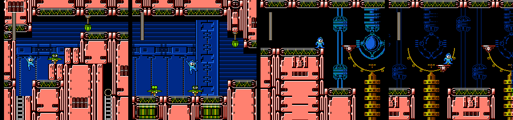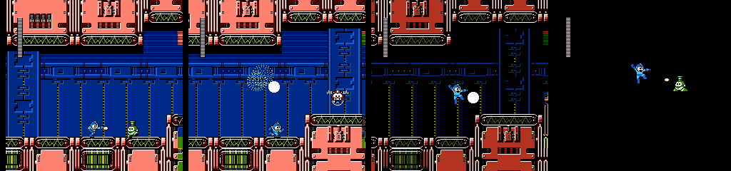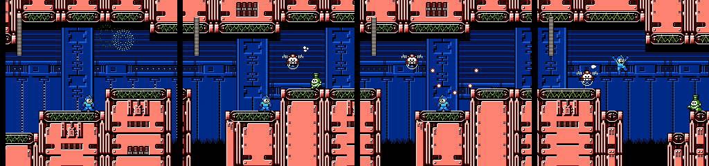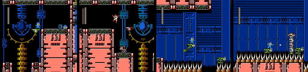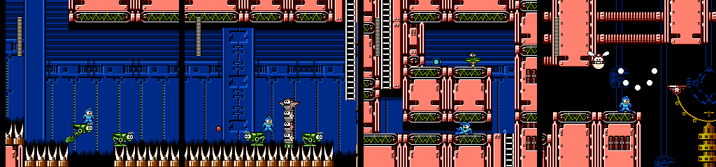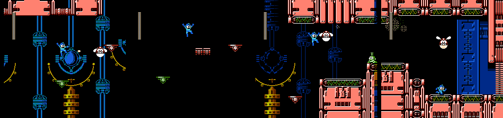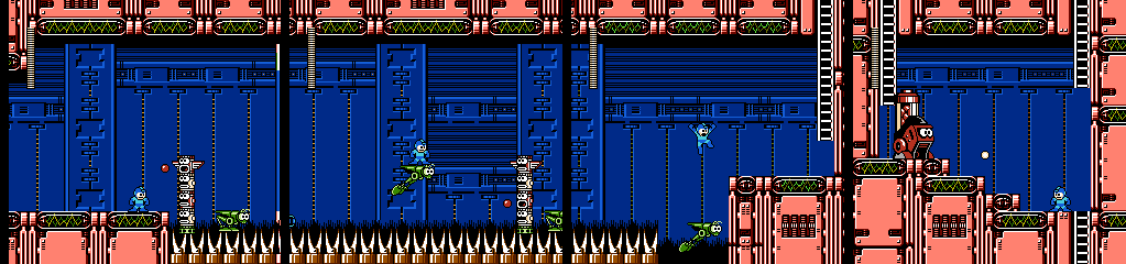 The following Battan section builds on the last, with more gaps and platform switching. Things can get messy in the middle since two Battans can be active in the same space, but the player won’t have to worry much as their collision is surprisingly forgiving, teleporting Mega Man on top whenever he clips into one. The Minoan waiting to drop on us in the next room is also a nice touch.