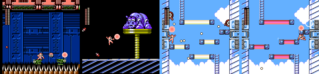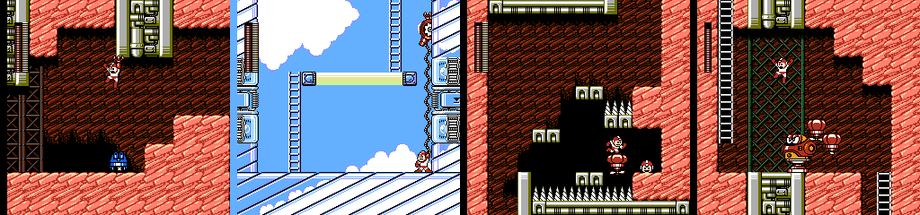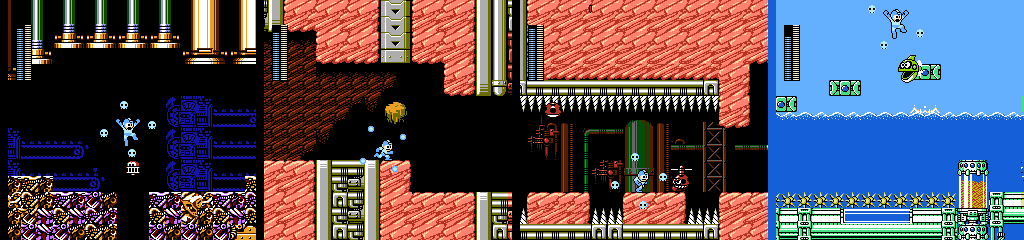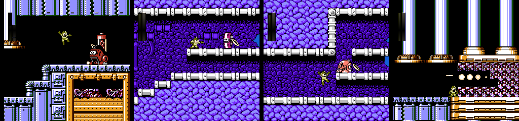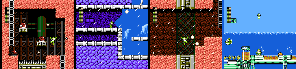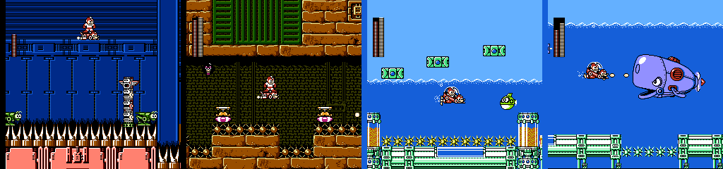 These are the secret items we picked up in Pharaoh Man and Dive Man’s stages, respectively. Balloon works just like Item 1 from Mega Man 2, while the Wire lets us grab the ceiling and pull ourselves up to it. Balloon can help us in a few areas where Rush Coil would be awkward, while Wire is… mostly useless. It’s fun though, and can let us avoid a couple troublesome enemies. It can also deal damage equal to the buster, but there are very few practical applications for this.