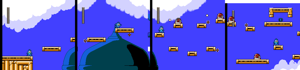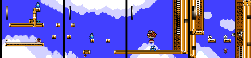 That said, the layout here is quite good. There are two paths, with more difficult enemies at first and a couple rewards on the upper one. The upper path also allows the player to skip the last couple enemies, and both paths converge at a group of smaller platforms. Mega Man can get back to the upper path, but this can be awkward with only Rush, so finding the Balloon item is useful here.