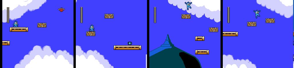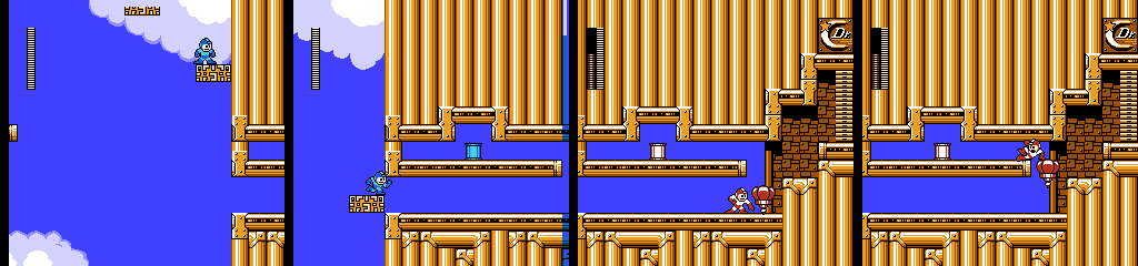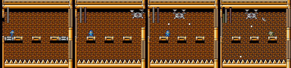 The last autoscroll section consists of a few normal platforms separated by a new gimmicky one. These appear when Mega Man gets close and slowly move downward when stood upon. Once Mega Man jumps off of it, it’ll move upward quickly, allowing the player to control its height. This also means that you’ll lose the platform once you leave it.