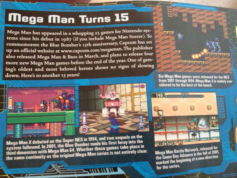I know people are pointing out the sad irony in the line saying that Mega Man “shows no signs of slowing down.” But it also mentions how FIVE Mega Man games are due to be released that year. These games are Mega Man & Bass, Mega Man Battle Network 3, Mega Man Network Transmission, Mega Man X7 and Mega Man Zero 2. And actually, BN3 came out in two flavors, so that’s six (perhaps X7 wasn’t counted, being a PS2 game). Kind of overkill, no?