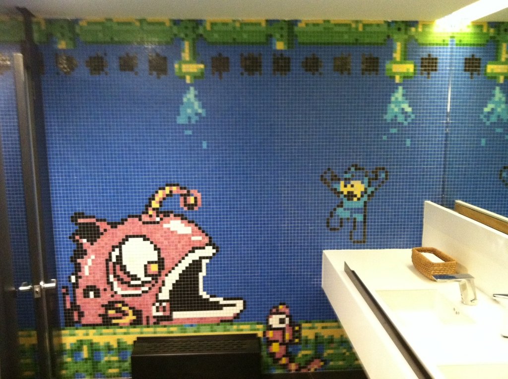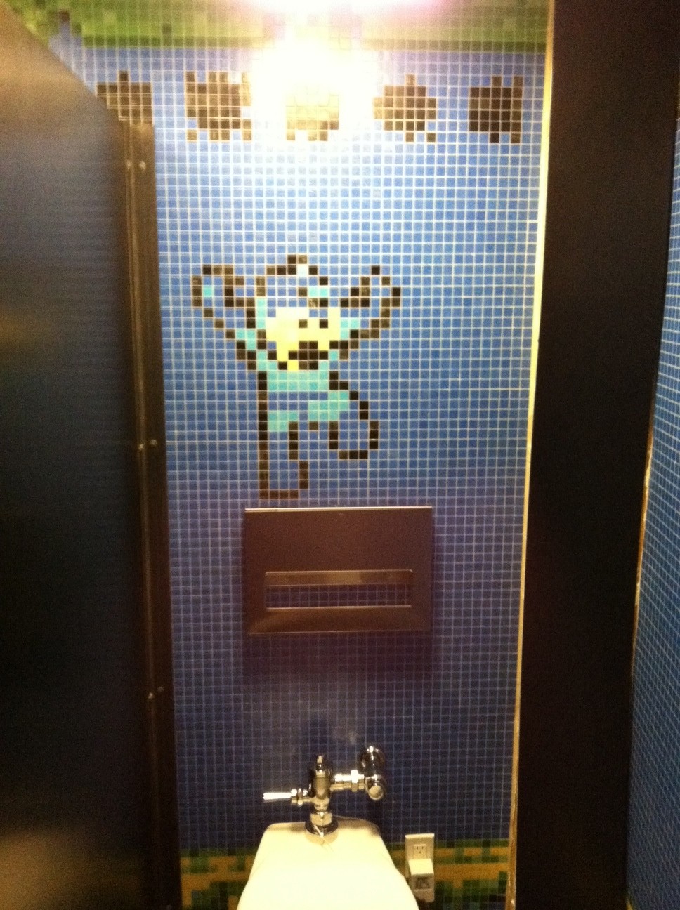 Okay, so maybe that’s not as appealing as it sounds, though Bubble Man’s stage was a good choice of backdrop. From what we can tell, this was made in an otherwise-unknown public restroom. Scroll down to see inside one of the toilet stalls.