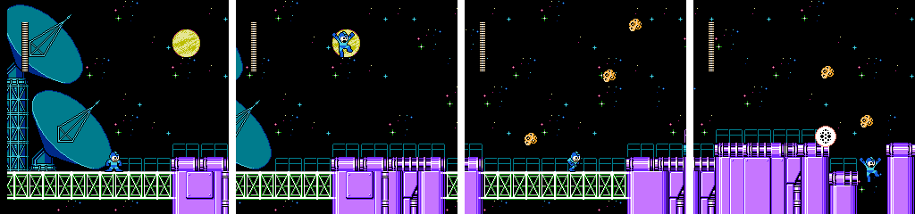Finally, a new stage mechanic… sort of. This entire stage takes place in space, which is functionally the same as being underwater. It begins with a mess of meteors falling on us as we run toward the hole. Dodging randomized falling objects is a simple concept, but fun nonetheless, and it’s a shame this only lasts for two screens.