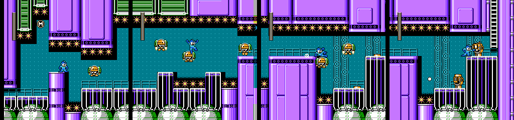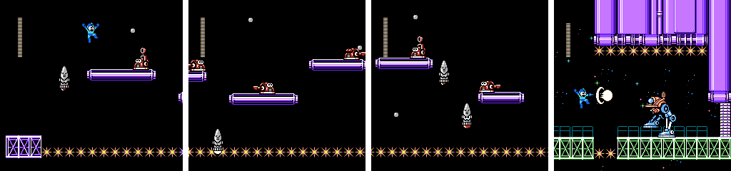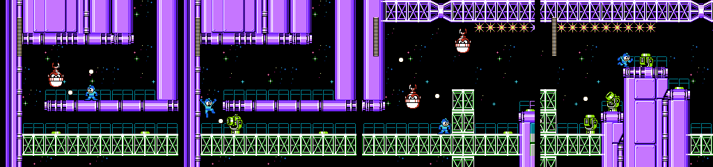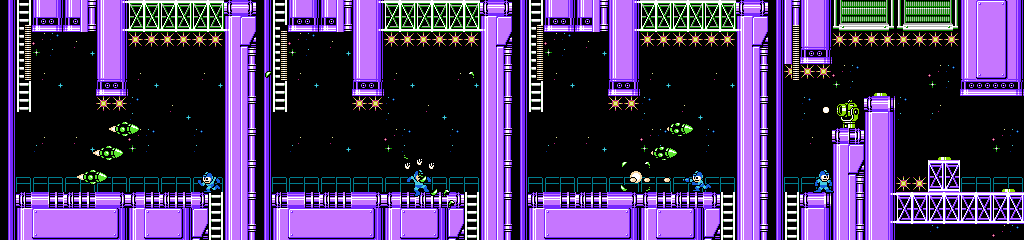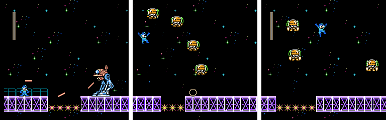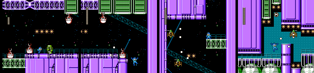 The Toss Machine section looks like the sort of thing that would work in this stage, but in practice there’s no bite to it. Space Metall and Jet Bomb are good additions, but the latter only gets one screen. On top of all that, the tight corridors in the first half keep the low gravity from coming into play much. It really needed a design closer to Air Man, with more open space and moving platforms. As it is, it feels like a simple underwater stage with a new coat of paint.