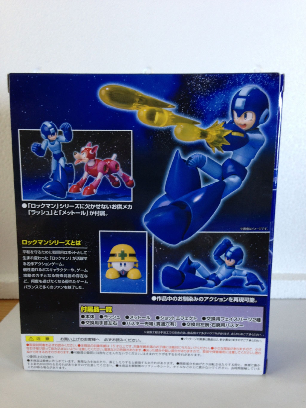 Before we get into the figure itself, here is another look at the front of the package alongside Vile. There are a few differences between the two worth noting, Japanese nomenclature aside. Whereas Vile’s features the large golden “X” design which partially obscures some of the figure and its accessories, Mega Man’s provides a clearer look at the Mega Man and Metool figure, with Rush peeking out from the side.