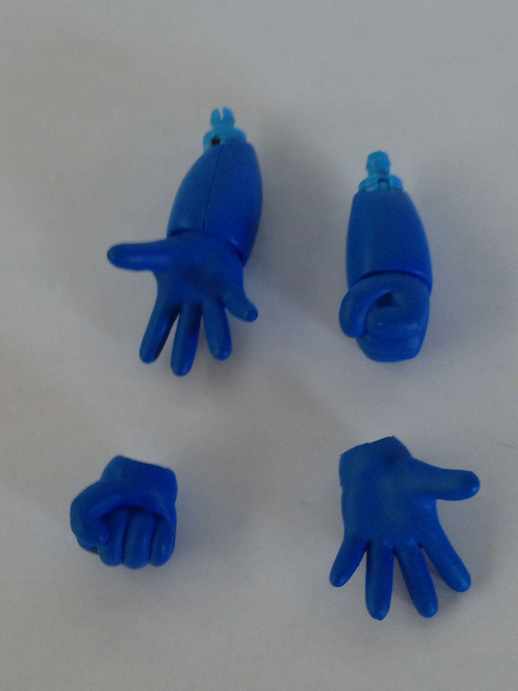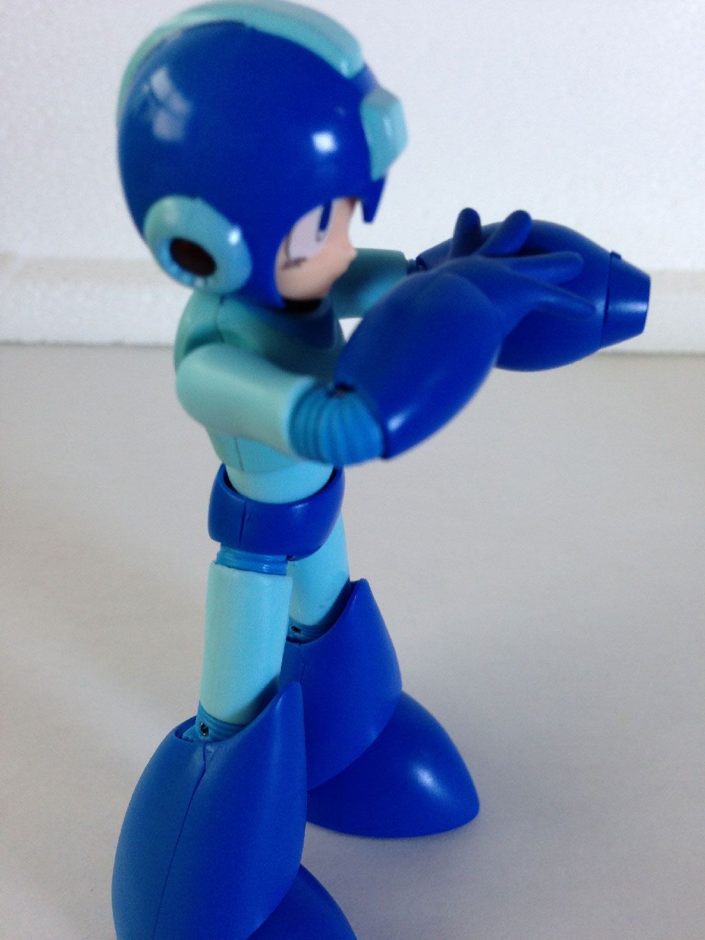 After swapping out the right fist for an open hand, I attempted to give Mega Man a more traditional “bracing the Mega Buster arm” aiming pose. The first attempt is on the left, and as you can see, it doesn’t quite work so well. But then I discovered something.