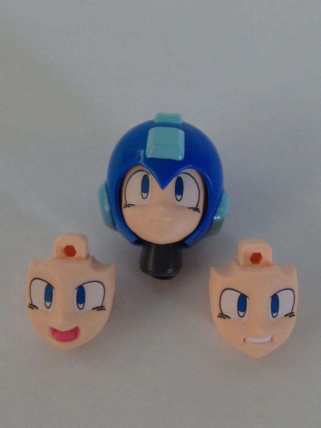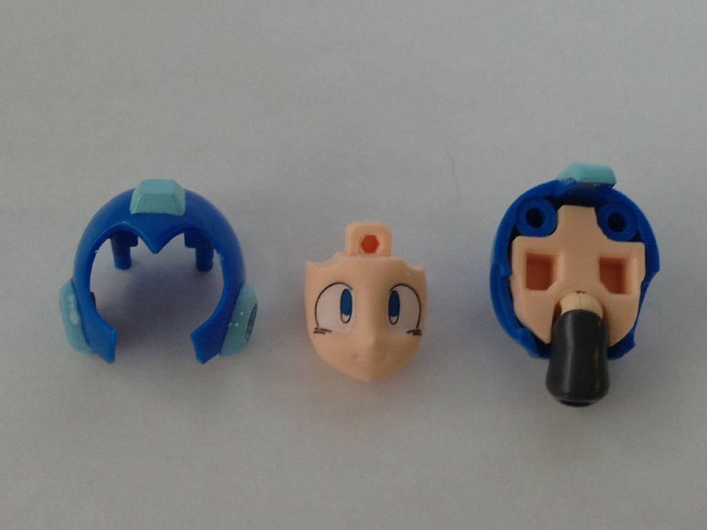 Mega Man also comes with three faces: The calm, static expression; a for when things begin to get ugly; and a full-on screaming rage for when it all hits the fan and he is in “more than just a robot die Wily” mode. Switching the faces out is a cinch, as you just remove the front of the helmet (which, for the record, features the same ruby-ish lens in the earpieces as in the Buster barrels and feet), pull out one face, plug in another, and put the front of the helmet back on. Rock’s luxurious hair doesn’t dwell underneath, but I suppose we can’t have it all.