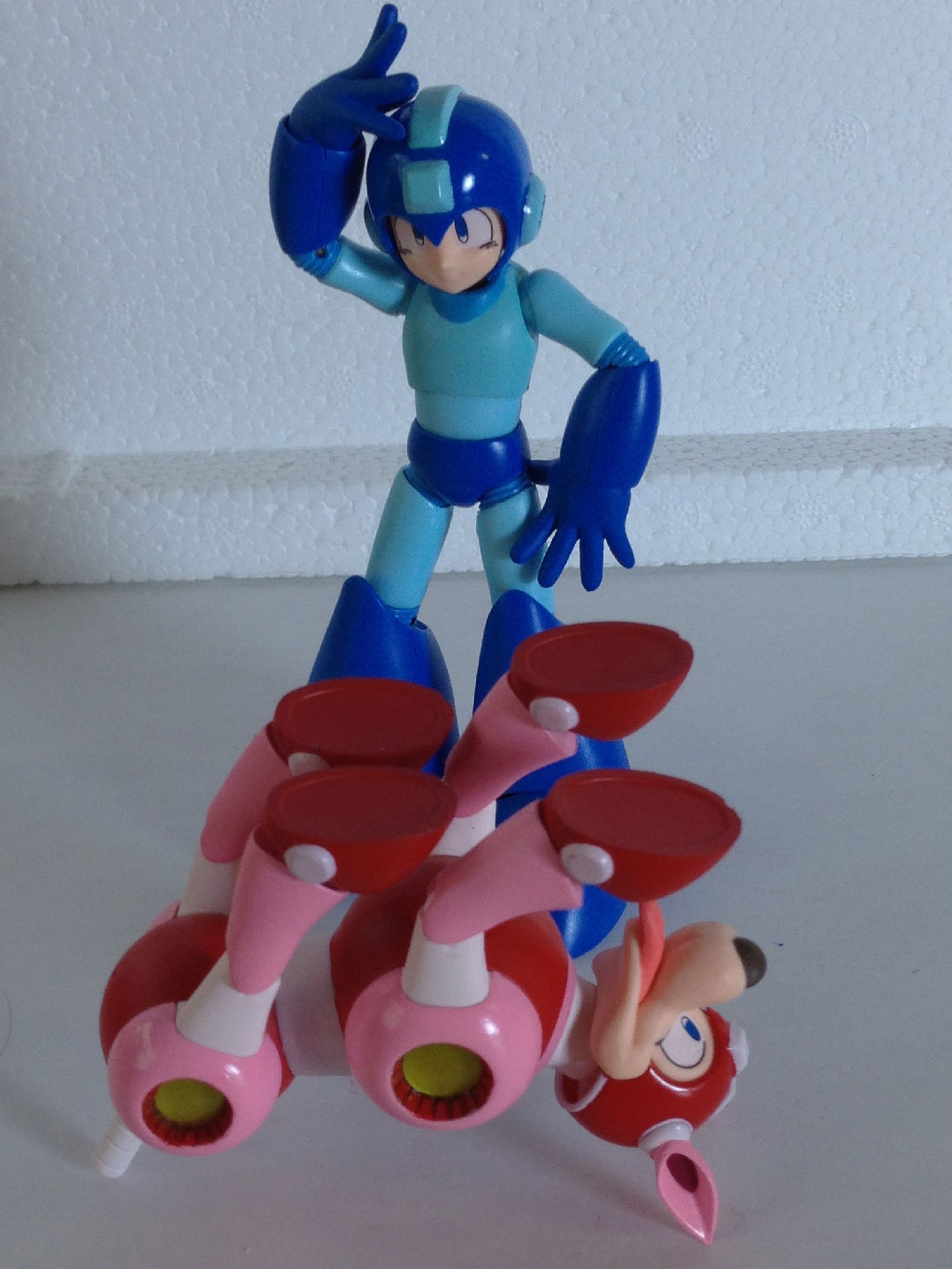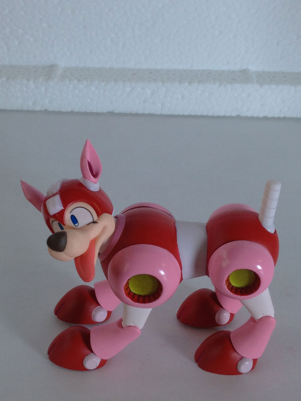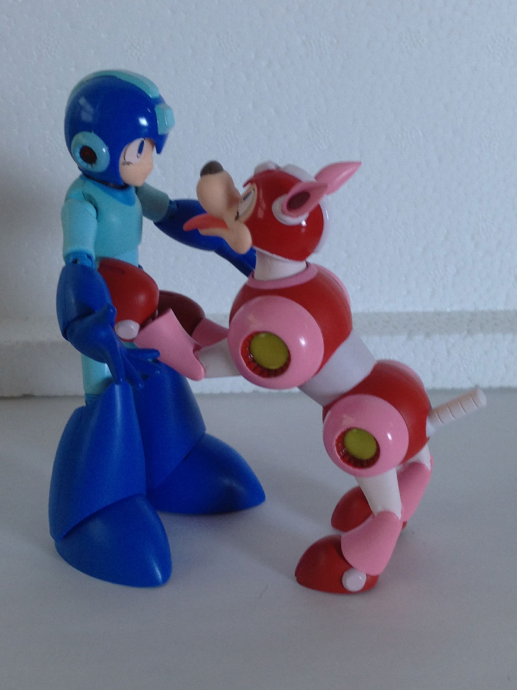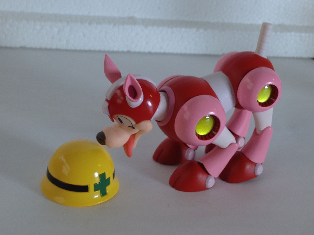 Here, we have Rush laying on his back… or trying, at least. Between his tail and head movement, his back never even touches my desk, with the ears and tail forming a perfect tripod. As you can see, Mega Man can’t seem to make heads or tails of it all.