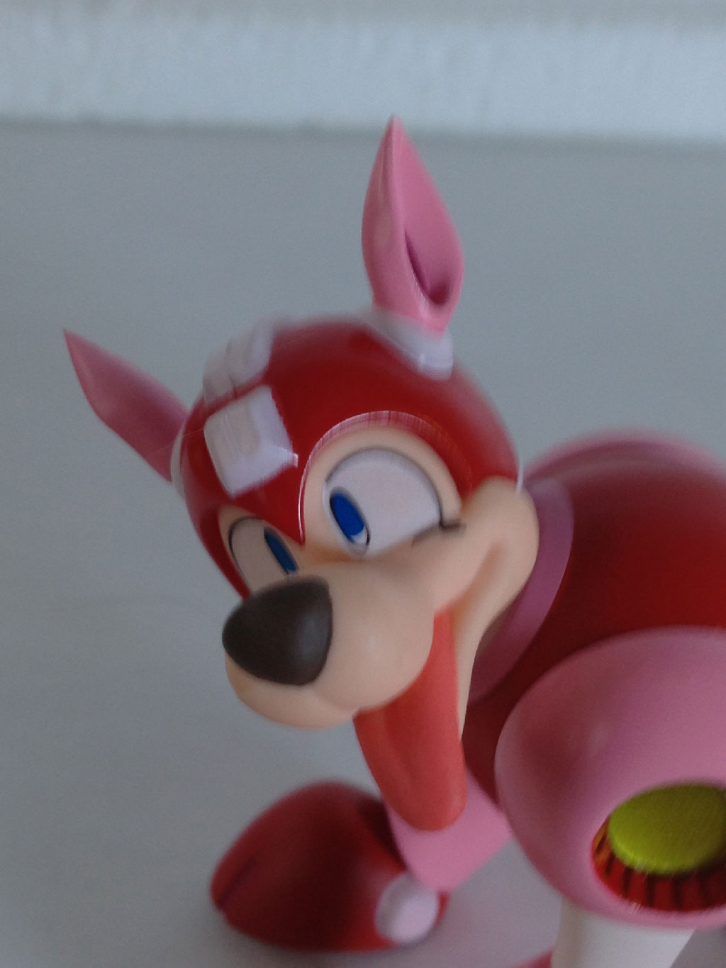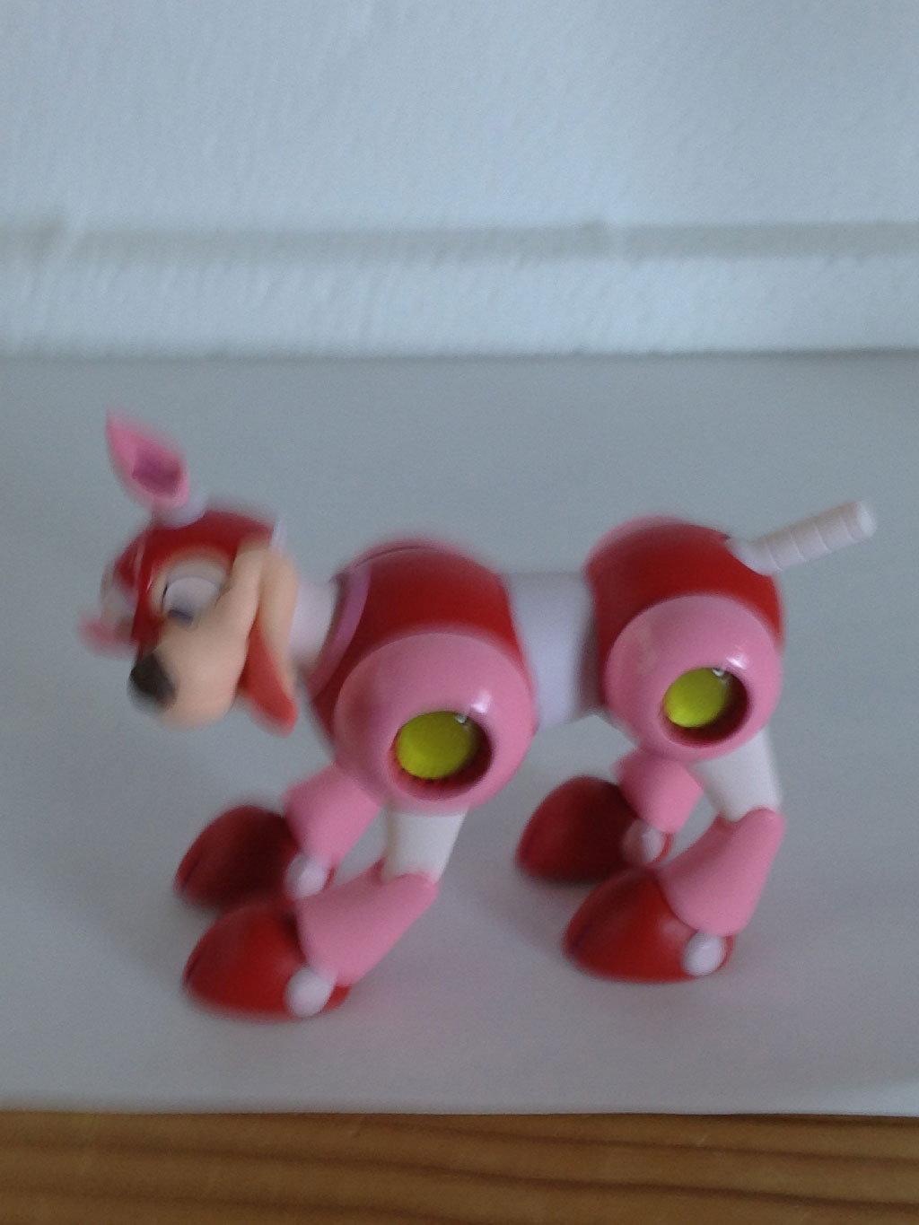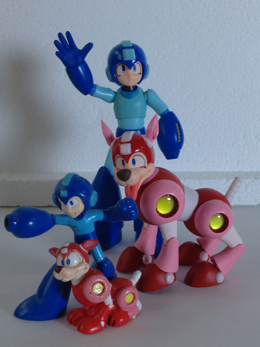 Here, we have Rush laying on his back… or trying, at least. Between his tail and head movement, his back never even touches my desk, with the ears and tail forming a perfect tripod. As you can see, Mega Man can’t seem to make heads or tails of it all.