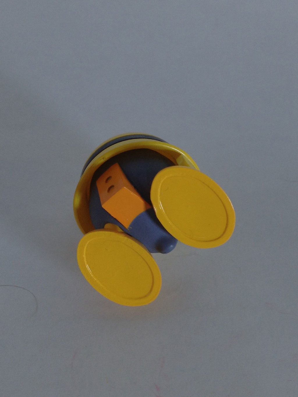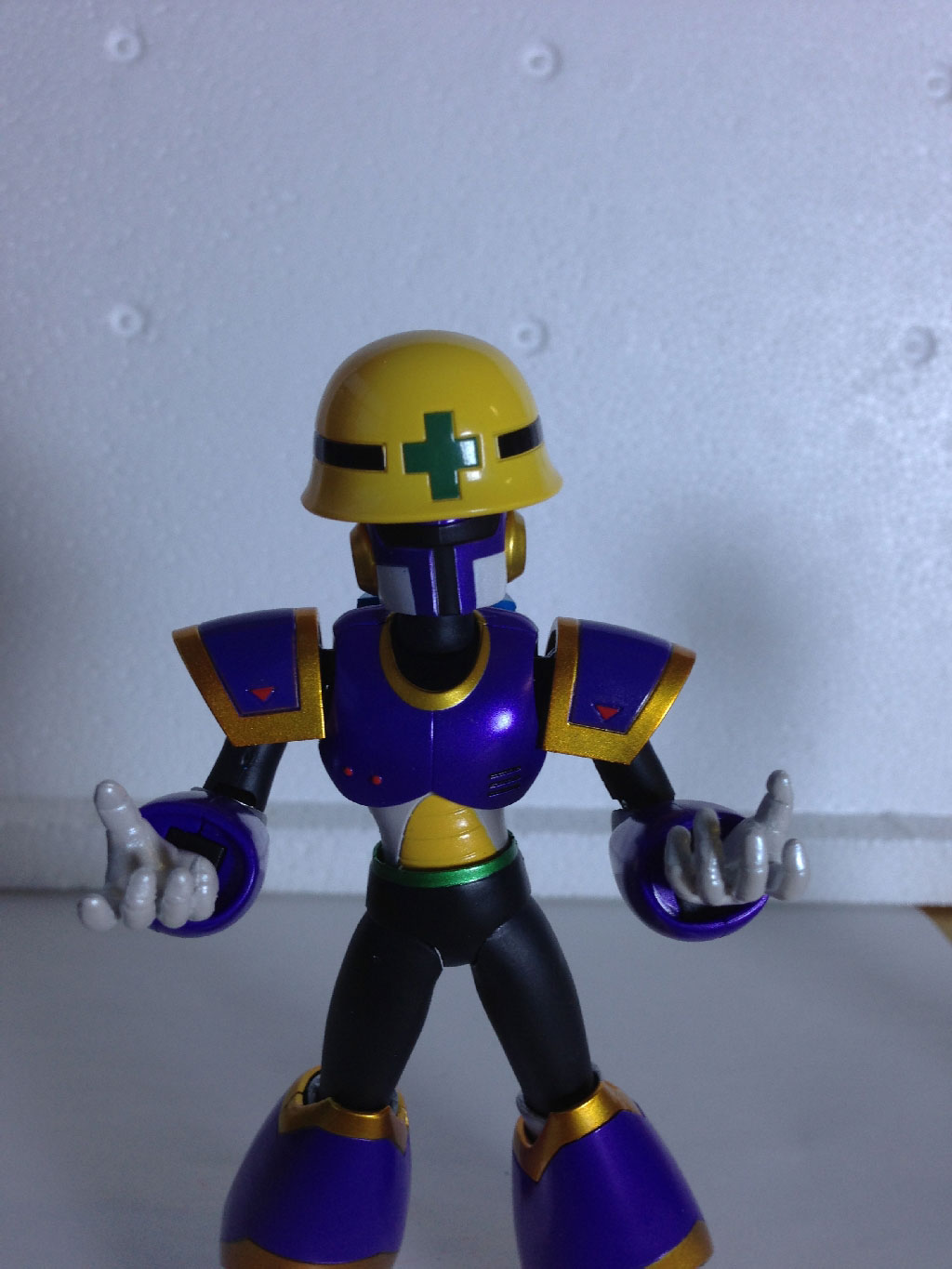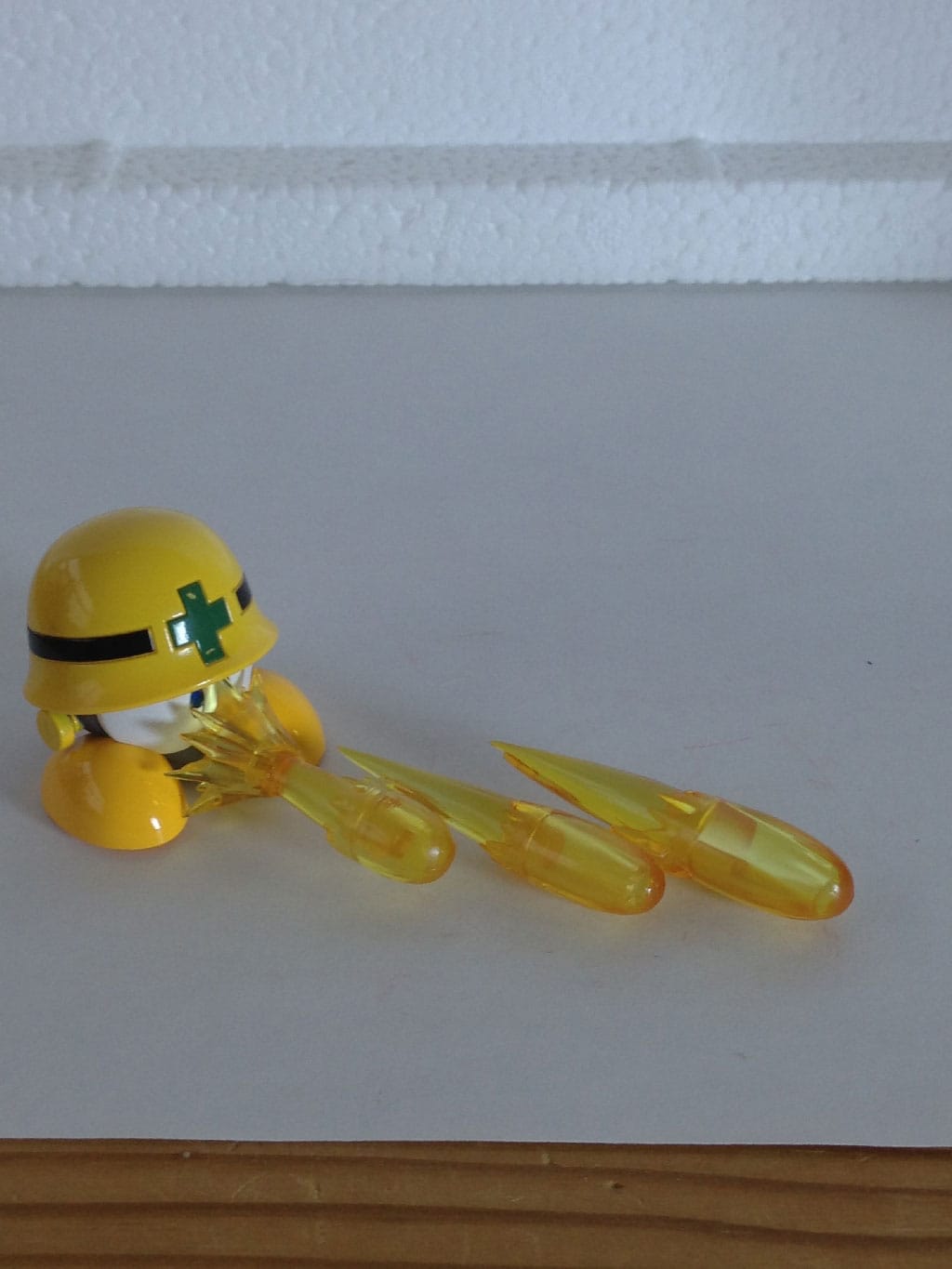 You can see here where the two pegs/prongs on the interior of the helmet can plug into the Metool’s head. Like Rush, there’s no detailing to speak of on the bottom. And while there is no way to actually plug in Mega Man’s burst of fire to give the Metool a ranged attack of his own, you can still improvise a bit, as seen at right.