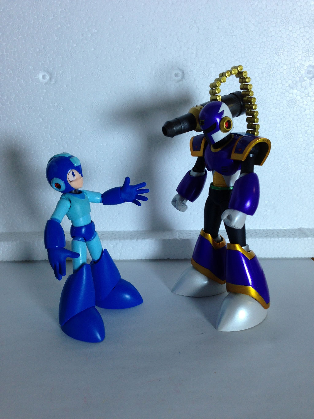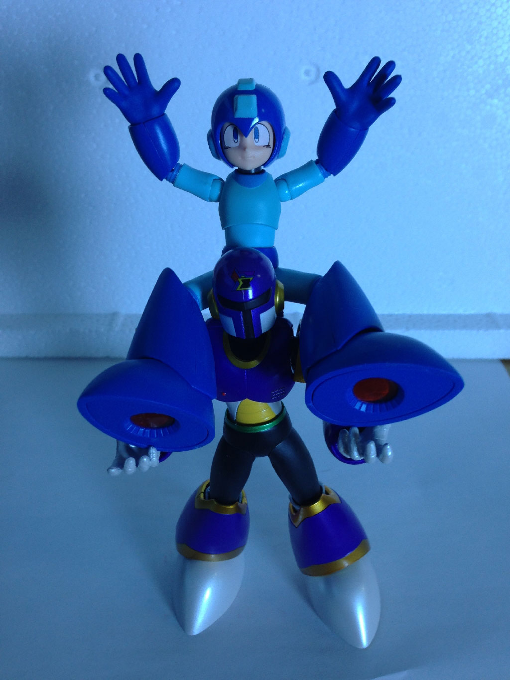 At left are the three figures together. Of the three, Mega Man is the only one given a height measurement by Gundam Planet and he measures in at 4.1 inches tall, which puts him to just about the right scale with Vile’s 5.1 inches (if we were to assume that he and X are about the same height when standing straight). That makes one inch approximately equal to one real-life foot, for those keeping count.