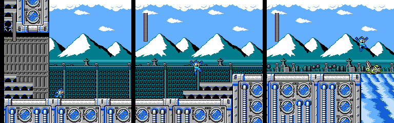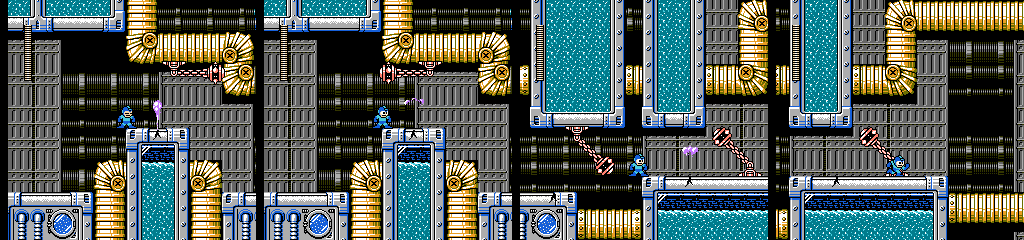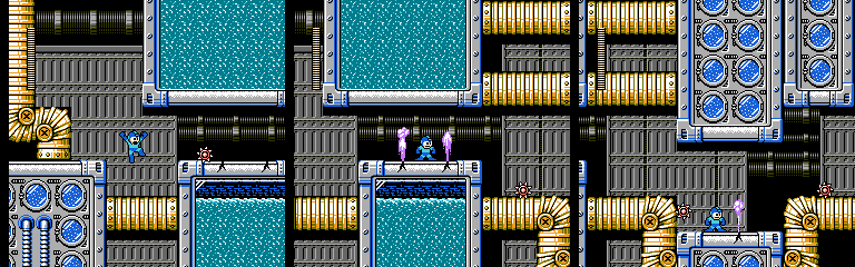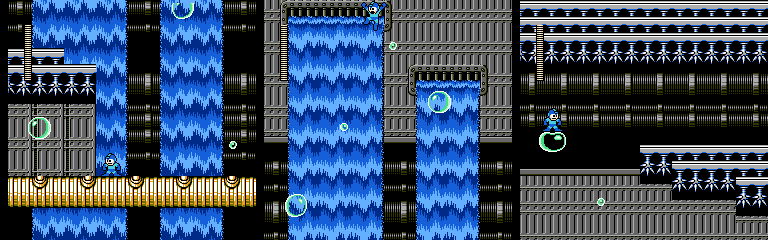 Here’s a neat stage gimmick. Bubbles appear from below, and Mega Man can ride them upward. The small ones break after a moment, so the player has to wait for an opportunity to jump across to each large bubble. I particularly like the last screen. If players know when the small bubble will come they’ll have enough time to jump onto it as it appears without worrying about hitting the spikes, but if the player needs to react to it they’ll be running short on headroom. However, a slide will get the player to the next bubble without risking the jump. For such a small moment, it does a good job of rewarding both knowledge of the game and strategic thinking.