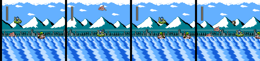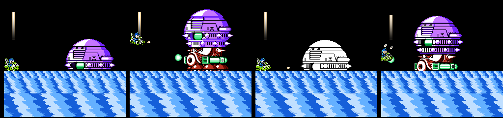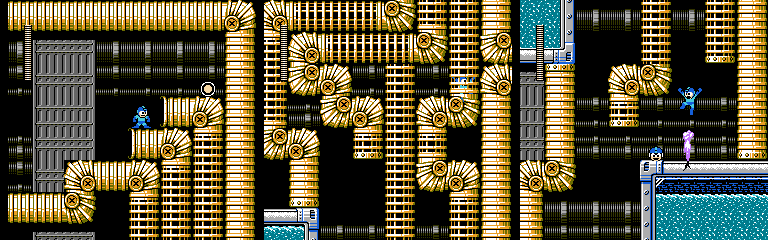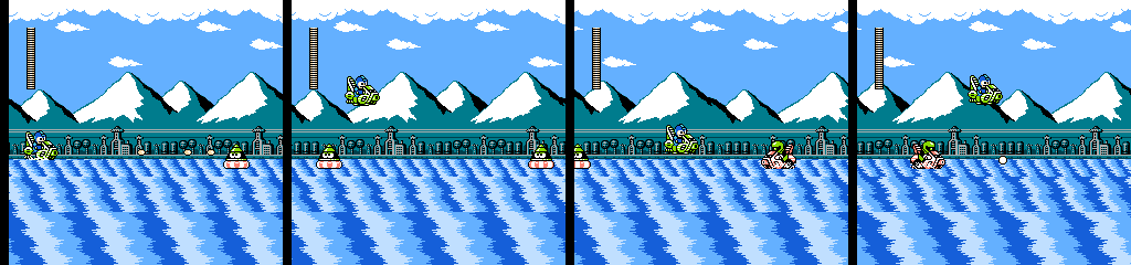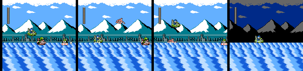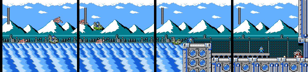 While I’m willing to give the vehicle segment credit for being reasonably fun on its own, this was not the proper way to introduce it. We only get about 10 screens worth of normal gameplay (ignoring the empty screens), and the Teckyuns and bubbles taunt us with the possibilities they had for use in a normal stage before it throws us in a jet ski all the way up to the boss door. A third segment with more complex traps would have helped round it out and justified the lackluster use of them in the first section, but I think this gimmick would have worked out better in a Wily stage, which already have a habit of being short and doing odd things now and then.