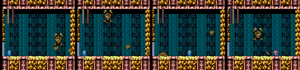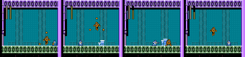 Stone Man jumps around the room. If he jumps high, he crumbles on the ground and can’t be damaged until he gets up again. Sometimes he’ll leave behind two swirling rocks, the max radius of which is about where the rock is in the third image.