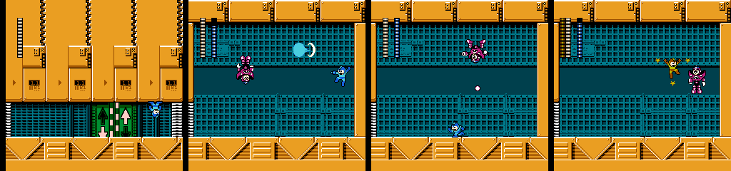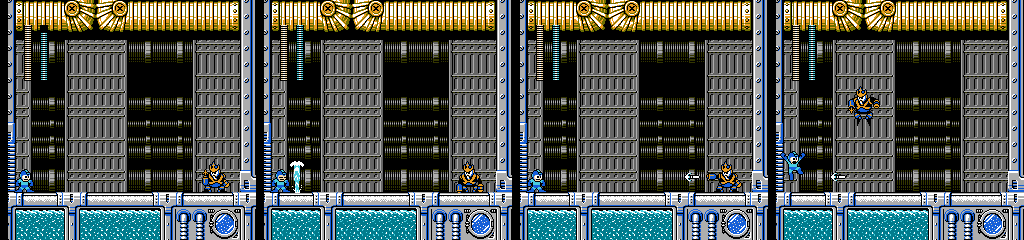 An interesting twist to this one is that Mega Man enters with gravity switched. Gravity Man walks around on the opposite side, switching gravity constantly. The only way to hit him with normal shots is to fire as you pass each other, which is a fairly neat idea. He’ll also jump and shoot now and then, which goes a long way toward breaking up an otherwise monotonous pattern.