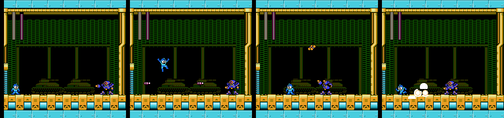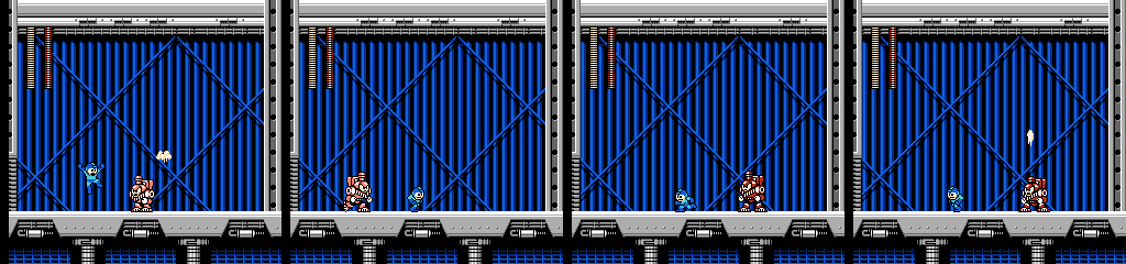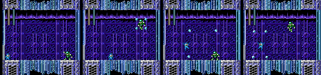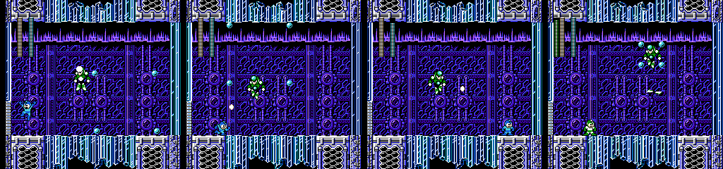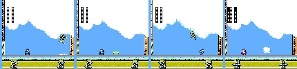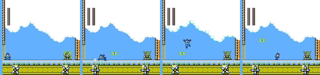 Once again, Gyro Man has two moves. The first is to fire a Gyro Attack forward that either moves upward when jumped over or downward when slid under. The second is to rise into the air, fire a gyro downward that moves toward Mega Man when it hits the floor, then fall down onto Mega Man’s position. He can use either at will. The clouds hide Gyro Man’s position, but he gains nothing from this since he’ll fire as soon as he enters them.