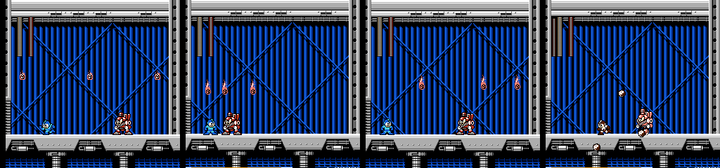 Napalm Man can fire three missiles forward, fire two bombs upward, or jump. This is another simple one, but the pattern works well. The bombs spread out more with distance so they’re easier to avoid when standing near him, but this leaves the player more vulnerable to missiles. At a medium distance it can sometimes be hard to decide between moving toward or away from him, and getting caught against a wall is particularly dangerous.
