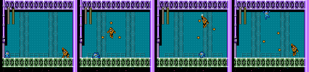 Another boss that moves only by jumping, Star Man creates a shield around himself and occasionally throws it at Mega Man. He’ll only do this from the peak of a high jump or when near the ground, and creates a spark from his arm to announce it. The shield is slow, and while it takes up a lot of room, the player can’t even be damaged by it until it’s been thrown. Mega Man also retains the low gravity physics from the stage, so this is another very easy boss to avoid.