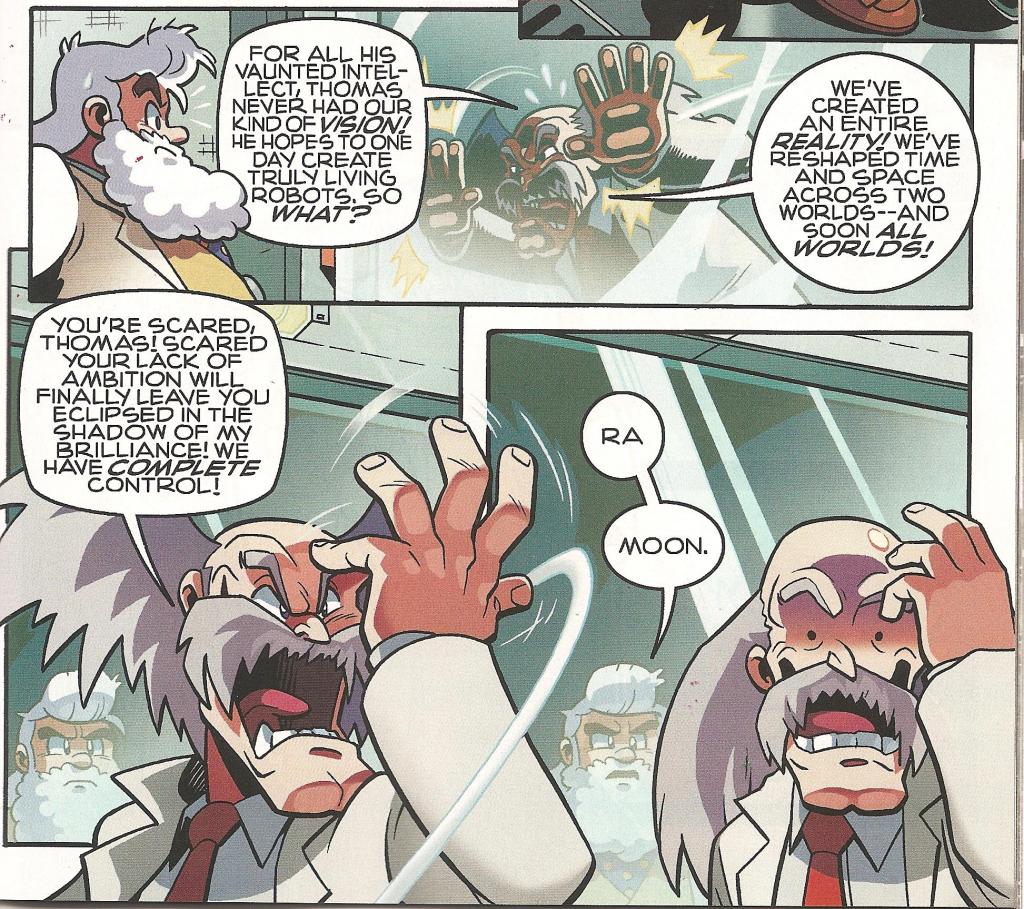 From the earliest days, when he hijacked the Roboticizer from Uncle Chuck and used it as a way to enslave the Mobian populace to his will, he’s been fighting a battle to make himself ascendant. He is by far the more menacing megalomaniac. He already knows he’s the greatest, most brilliant mind on his world. He doesn’t have to prove that to anyone, though he may spout it off just to remind them from time to time.